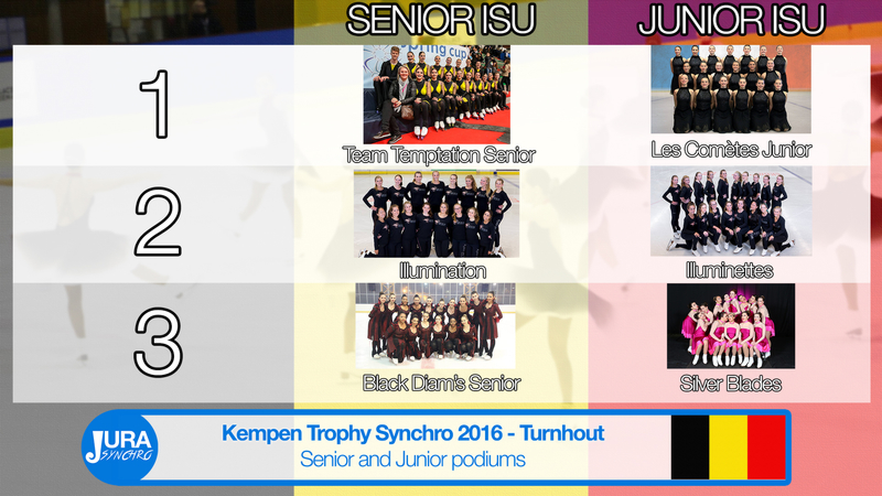 rnIn the Junior A, three countries are represented. France is first with Les Comètes Junior (total score : 103,60 points). The Illuminettes from the Netherlands are second with 75,44 points. And the Silver Blades from Great Britain placed third with 63,11 points.
