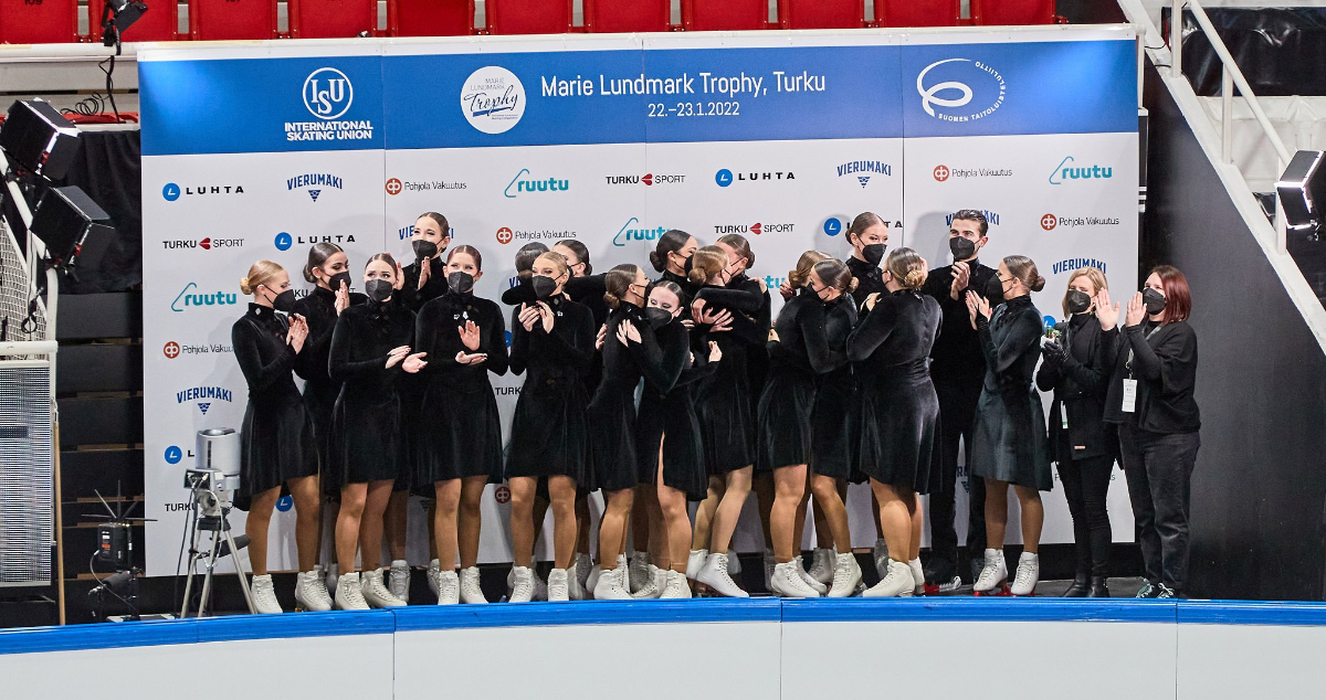The happiness after the free program! The team learns that it has reached the minimum score. (Credits: Tero Wester Photography - 2022)